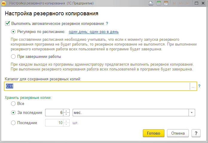 Если выбран пункт Выполнять резервное копирование при завершении работы, то при каждом выходе из системы администратору будет предлагаться выполнить резервное копирование ИБ. Если в ИБ одновременно работают два и более администратора с ролью Полные права, то предложение о резервном копировании будет выдано последнему администратору, который выходит из системы.