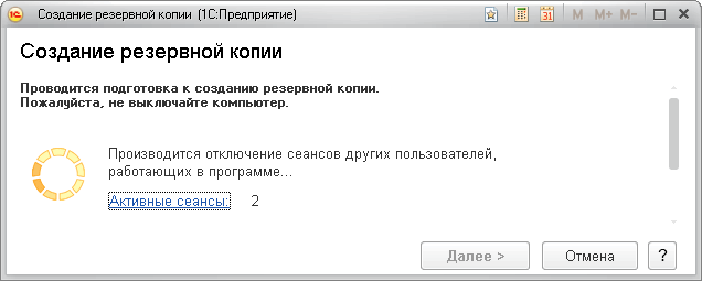 Если система не сможет завершить работу всех пользователей, то примерно через 5 минут она предложит выполнить резервное копирование при подключенных к ИБ пользователях. С предложением системы можно согласиться, если администратор уверен в том, что подключенные пользователи не вводят данные в ИБ (например, если пользователи в конце рабочего дня забыли выйти из системы). В противном случае необходимо завершить сеансы пользователей на их рабочих местах.