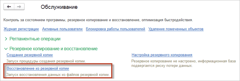 Для восстановления данных из резервной копии используется помощник Восстановление данных информационной базы из резервной копии.