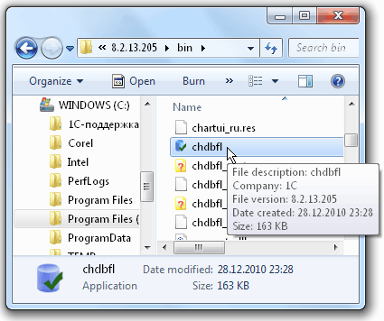 Чтобы исправить файл информационной базы, требуется для запуска утилиты в каталоге установки приложения 1С:Предприятие дважды щелкнуть мышью по наименованию файла chdbfl.exe.