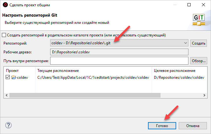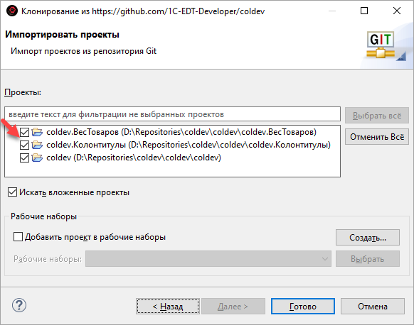 1C:EDT покажет вам проекты, находящиеся в удаленном репозитории. Отметьте их все, если их несколько, и нажмите Готово.