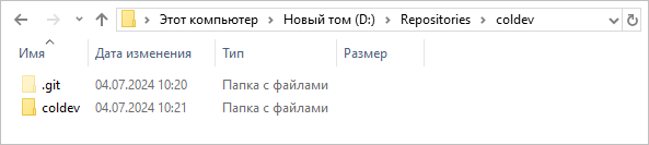 В результате в вашей локальной папке будет создана папка .git и папка с именем исходного репозитория (coldev в вашем случае). Будут скачаны все данные для этого репозитория и будет извлечена рабочая копия последней версии.