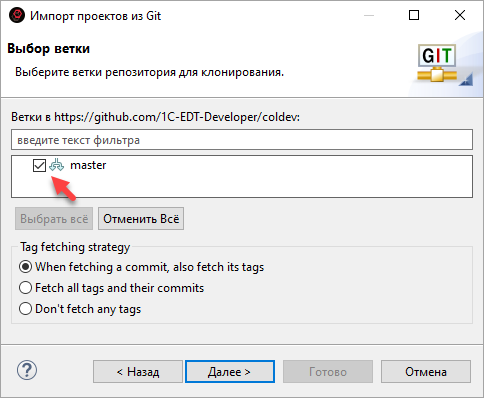 Вы увидите ветки, которые есть в этом репозитории. Если вы точно знаете, какие ветки вам нужны, выберите их. В противном случае отметьте все ветки и нажмите Далее.