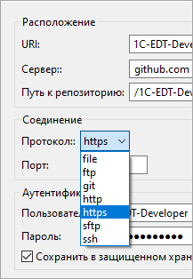 В поле URI укажите адрес репозитория, который вы хотите клонировать. Укажите пользователя и пароль для доступа к удаленному репозиторию. Установите флажок Сохранить в защищенном хранилище, чтобы 1C:EDT могла в дальнейшем автоматически использовать эти данные для аутентификации. Нажмите Далее.