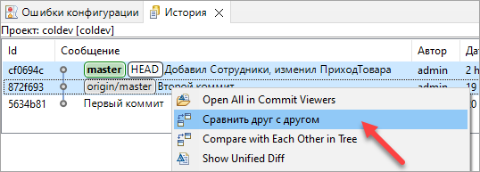 Панель История предоставляет очень полезную возможность сравнить два произвольных коммита между собой. Для этого выделите их в панели, и в контекстном меню нажмите Сравнить друг с другом.