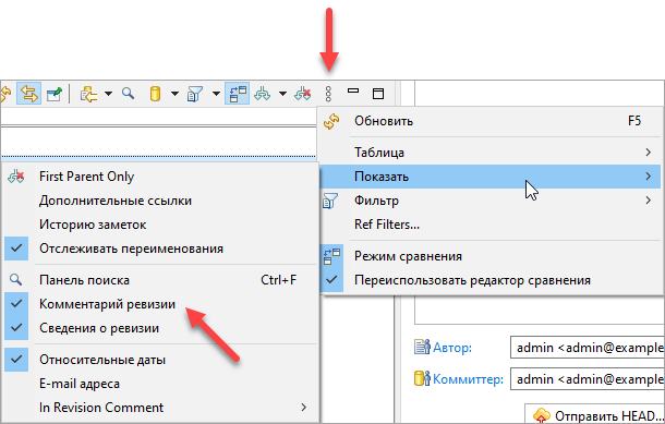 Кроме этого вы можете влиять на представление данных в таблице истории коммитов. Например, вместо относительных дат (4 days ago), вы можете использовать абсолютные даты. Для этого снимите флажок Показать > Относительные даты в дополнительном меню.