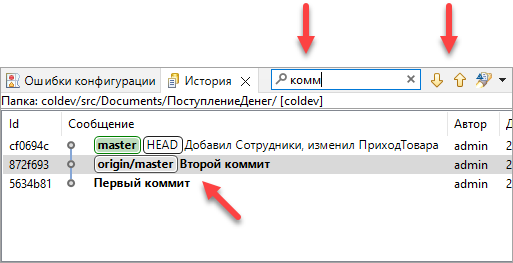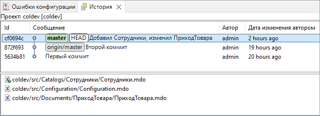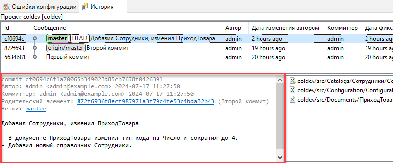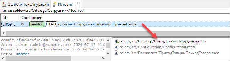 После этого выделите нужный объект в панели Навигатор и, если панель еще не открыта, в контекстном меню нажмите Групповая разработка > Показать историю. Вы увидите только те коммиты, в которых участвовал выбранный вами объект. Например, справочник Сотрудники.