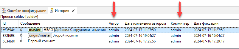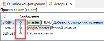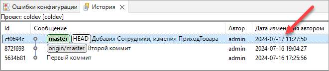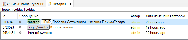 Однако для просмотра истории коммитов вам совсем не обязательно переключаться на перспективу Git. Вы можете открыть панель История и находясь в перспективе 1С:Enterprise.
