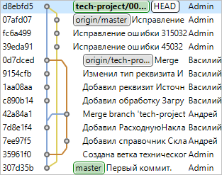 Но в реальных проектах ветвление используется часто, и тогда граф веток может выглядеть, например, следующим образом.