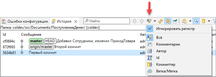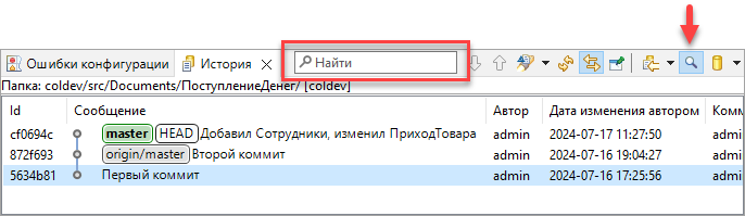 Помимо фильтрации, панель История позволяет вам быстро найти интересующие вас коммиты среди тех, которые уже показаны. Для этого вы можете использовать строку поиска, которая включается кнопкой на командной панели.