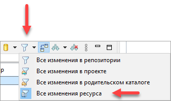 Для этого сначала убедитесь, что в командной панели выбран вариант фильтрации (Change the File Scope for the History) > Все изменения ресурса.