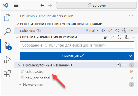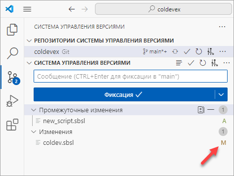 Файл coldev.sbsl находится в разделе Изменения (Changes) и отмечен буквой MИзменен (Modified). Это означает, что отслеживаемый файл был изменен в рабочем каталоге, но пока не проиндексирован.