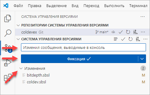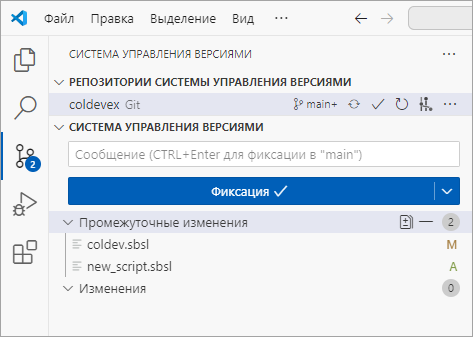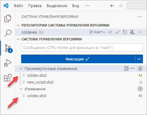 Допустим, вы изменили файлы bitdepth.sbsl и coldev.sbsl без индексирования. Если вы откроете представление Система управления версиями (Source Control), вы увидите что эти файлы изменены и они не включены в индекс.