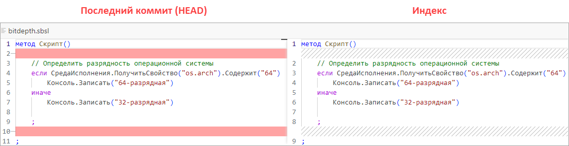 Теперь посмотрите другой пример. Вы уже проиндексировали файл bitdepth.sbsl, но решили внести в него дополнительные изменения. В этом случае вы можете просмотреть как проиндексированные изменения в этом файле, так и те, что пока не проиндексированы.
