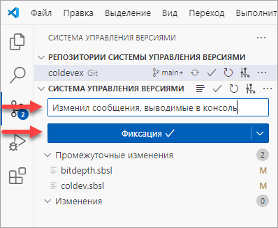 Допустим, вы добавили в индекс все измененные файлы и готовы к коммиту. Простейший способ зафиксировать изменения?—?это ввести сообщение коммита и нажать Фиксация (Commit) в представлении Система управления версиями (Source Control).
