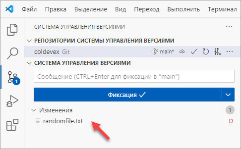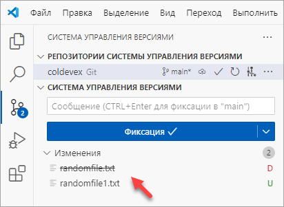 3. Файл randomfile.txt появится в разделе Изменения (Changes) как неотслеживаемый и в то же время в индексе появится запись об удалении этого файла;