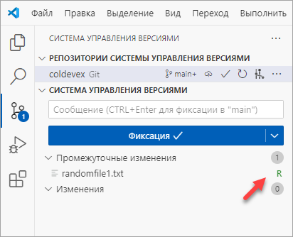 Однако как только вы поместите эти изменения в индекс, картина изменится и Visual Studio Code покажет вам, что файл был переименован. Она отметит его значком RПереименовано в индексе (Index Renamed).