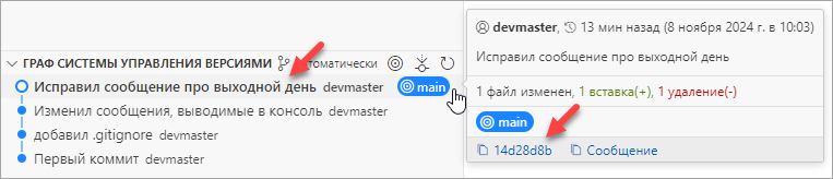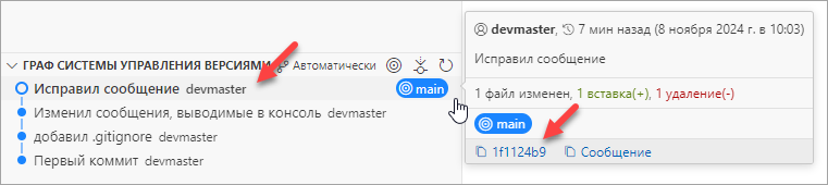 В разделе Граф системы управления версиями (Source Control Graph) в увидите, что сообщение изменилось, как вы и хотели. Если вы посмотрите на подробности то увидите, что изменился и идентификатор коммита. Вместо 1f1124b9 он стал 14d28d8b.