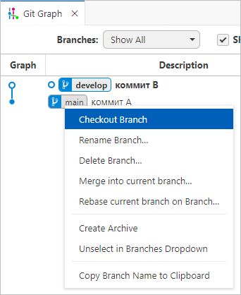 В этом разделе вы рассмотрите команды Reset current branch to this Commit... и Checkout Branch, которые содержатся в контекстном меню коммита и ветки в расширении Git Graph.