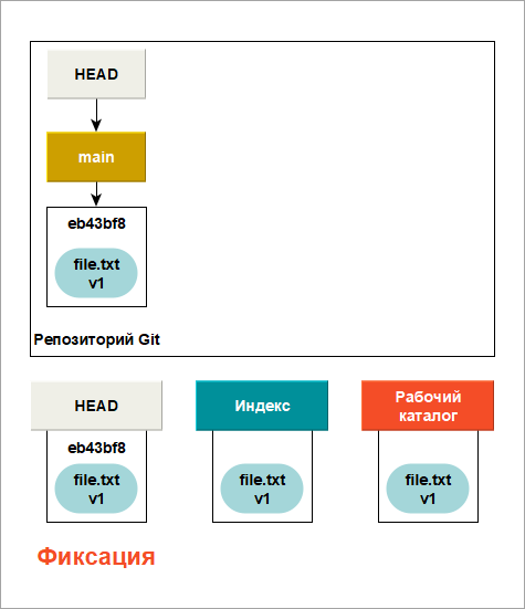 Рассмотрите этот процесс: допустим вы перешли в новый каталог, содержащий один файл. Данная версия этого файла обозначается v1 и изображается голубым цветом. Создайте Git-репозиторий, и его ссылка HEAD станет указывать на еще несуществующую ветку (ветка main пока не существует).
