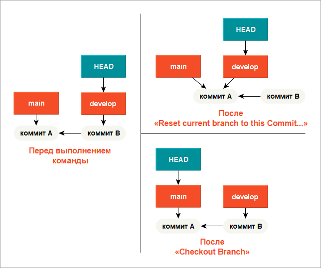 Если вы выполните Reset current branch to this Commit... на ветке main, сама ветка develop станет ссылаться на тот же коммит, что и main.