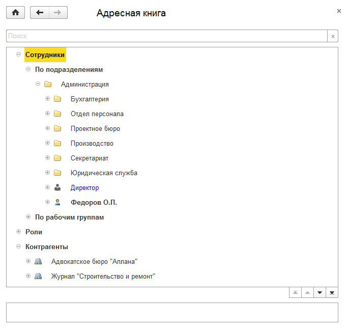 Адресная книга расположена в меню раздела Совместная работа. С ее помощью можно не только просматривать информацию о пользователях, контрагентах, физических лицах и ролях, но и создавать процессы.