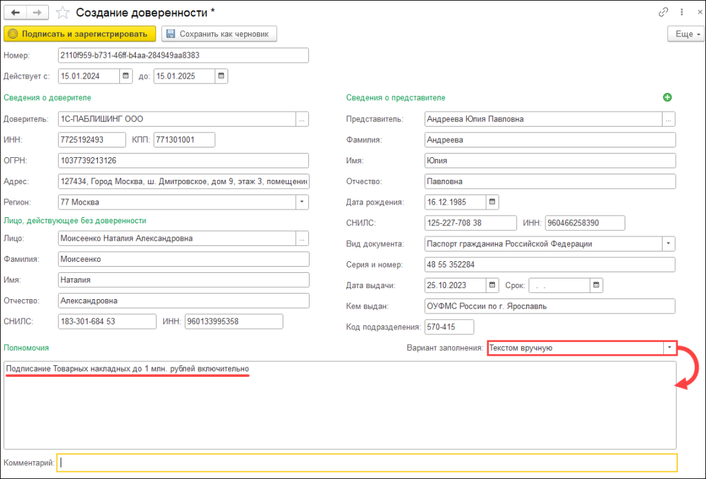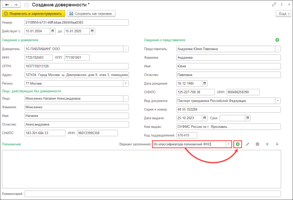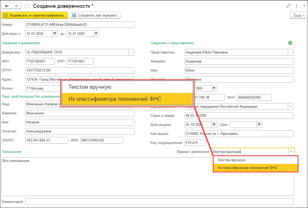 В программе есть 2 варианта заполнения полномочий – Текстом вручную и Из классификатора полномочий ФНС.