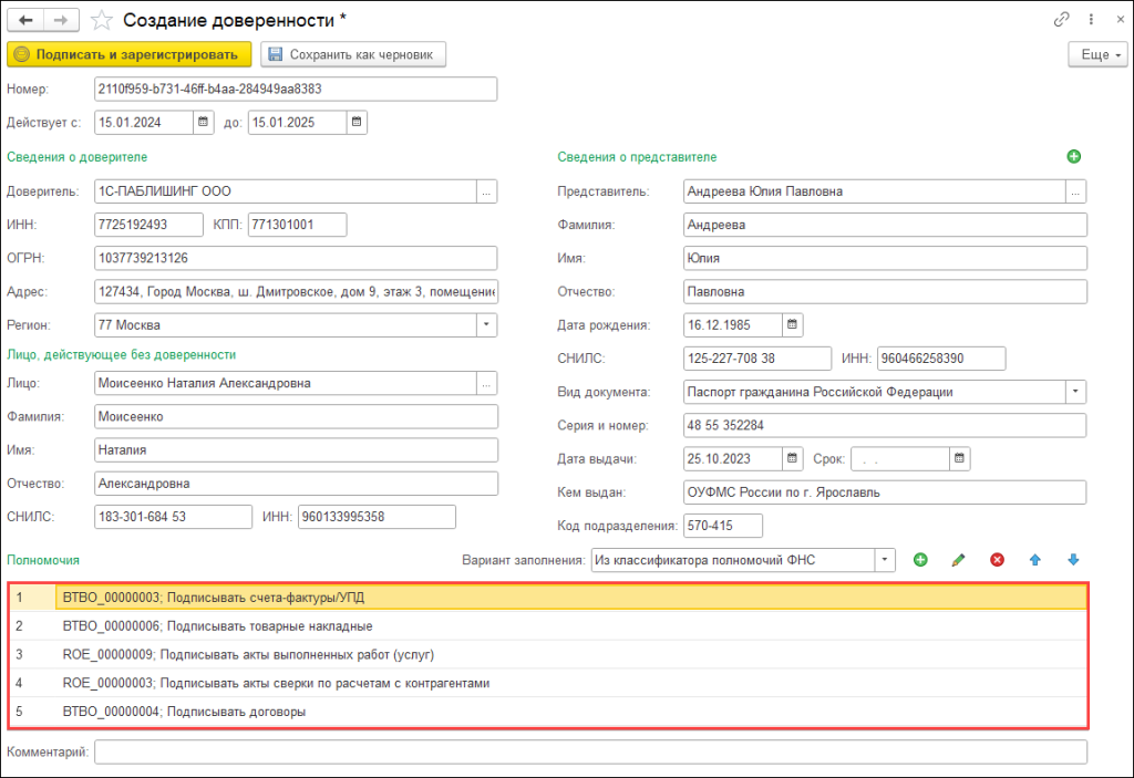По умолчанию во время создания доверенности в ней указаны "Все полномочия". Значение по умолчанию нужно убрать и поставить те ограничения, которые требуются.