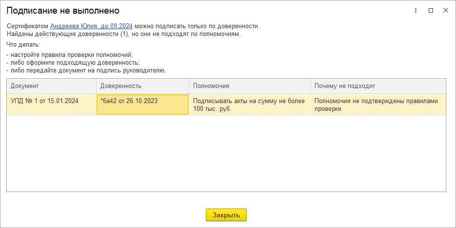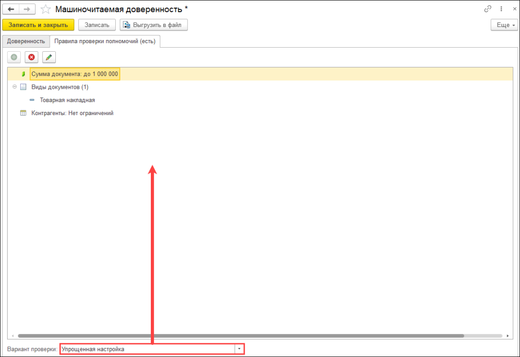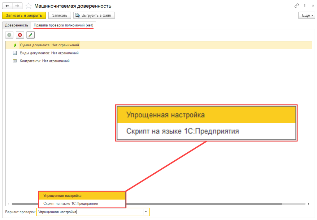 Если полномочия ограничены «Текстом вручную», но правила для автоматической проверки не заданы, то использовать данную доверенность будет невозможно.