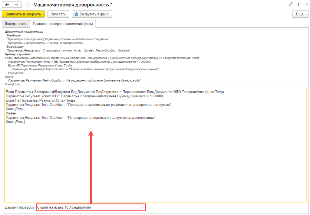 Параметры.Результат.Успех = НЕ Параметры.ЭлектронныйДокумент.СуммаДокумента > 1000000; Если Не Параметры.Результат.Успех Тогда Параметры.Результат.ТекстОшибки = "Превышена максимально разрешенная доверенностью сумма"; КонецЕсли; Иначе Параметры.Результат.ТекстОшибки = "Не разрешено подписание документов данного вида"; КонецЕсли; |