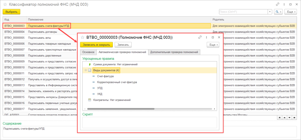После регистрации в реестре ФНС в доверенности появится специальная вкладка для автоматической проверки полномочий – "Правила проверки полномочий".