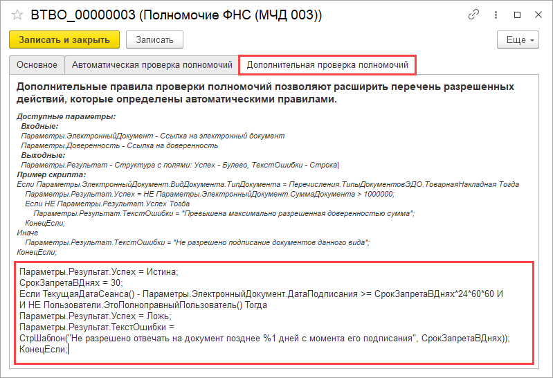 СрокЗапретаВДнях = 30; Если ТекущаяДатаСеанса() - Параметры.ЭлектронныйДокумент.ДатаПодписания >= СрокЗапретаВДнях*24*60*60 И И НЕ Пользователи.ЭтоПолноправныйПользователь() Тогда Параметры.Результат.Успех = Ложь; Параметры.Результат.ТекстОшибки = СтрШаблон("Не разрешено отвечать на документ позднее %1 дней с момента его подписания", СрокЗапретаВДнях)); КонецЕсли; |