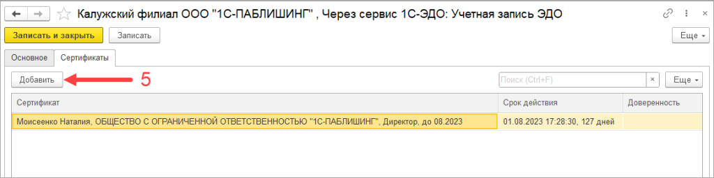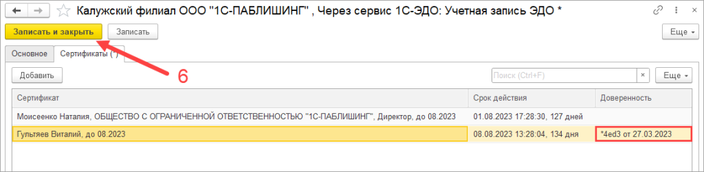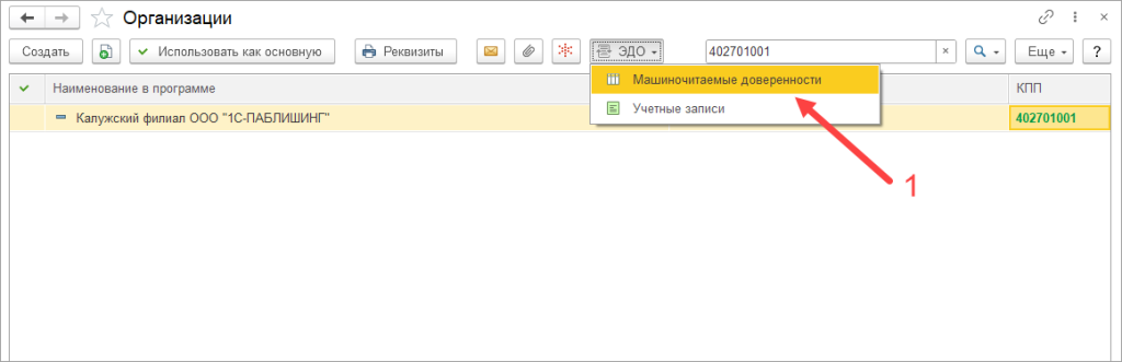 В программах 1С поддержана возможность отправки электронных документов, созданных от имени филиалов и представительств, через идентификатор участника ЭДО головной организации. В этом случае для подписания документов обособленного подразделения используется сертификат единоличного исполнительного органа юридического лица, или сертификат сотрудника юрлица (до 31.08.2023), или сертификат уполномоченного лица на основании машиночитаемой доверенности (МЧД). МЧД оформляется из карточки организации.