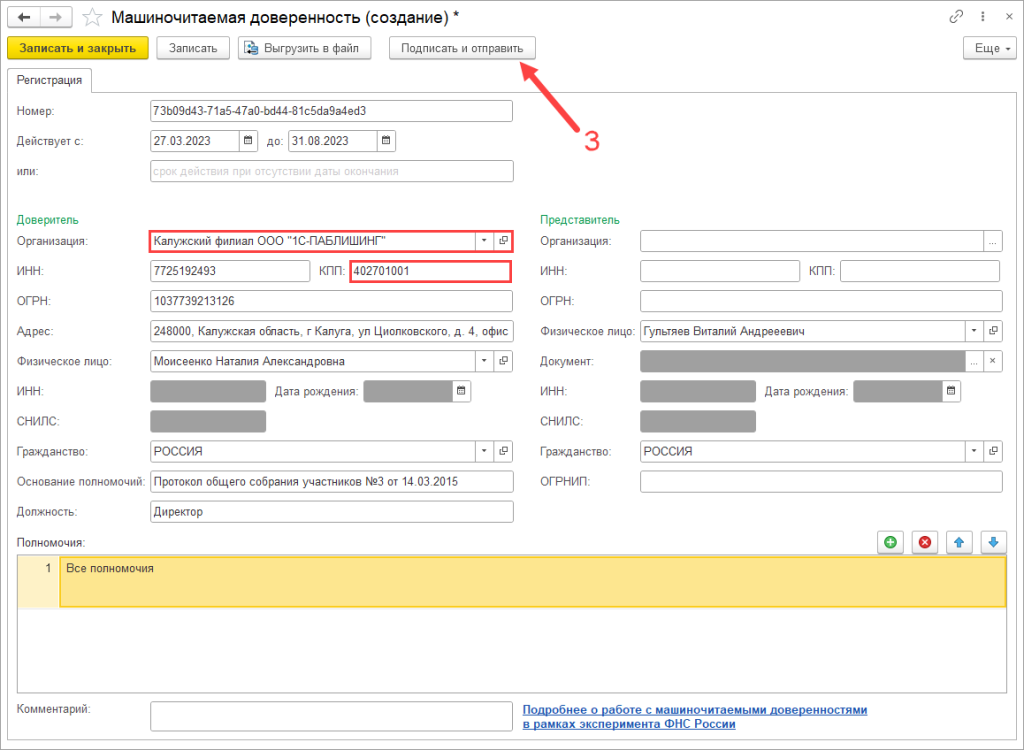 Стоит учитывать, что если обособленное подразделение использует собственный идентификатор участника ЭДО, то в сведениях о доверителе в качестве организации должен быть указан соответствующий филиал или представительство.