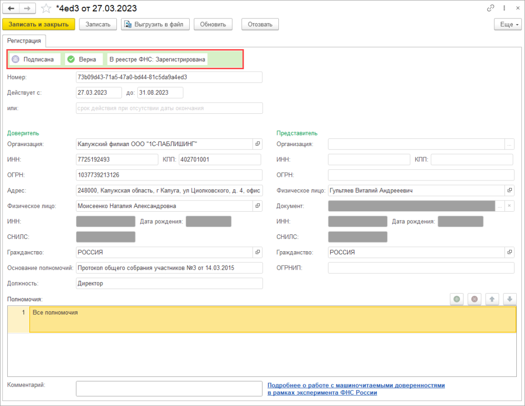 В открывшейся карточке регистрации новой машиночитаемой доверенности требуется заполнить необходимые данные и нажать «Подписать и отправить» , после чего доверенность перейдёт в статус «Подписана» «Верна» «В реестре ФНС: Отправлена»