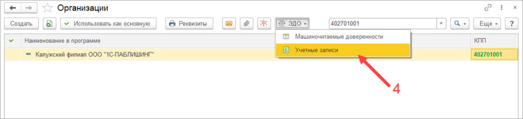 После оформления доверенности следует произвести регистрацию сертификата представителя у оператора ЭДО. Для этого в карточке обособленного подразделения следует нажать ЭДО – Учётные записи, и открыть интересующее подключение.