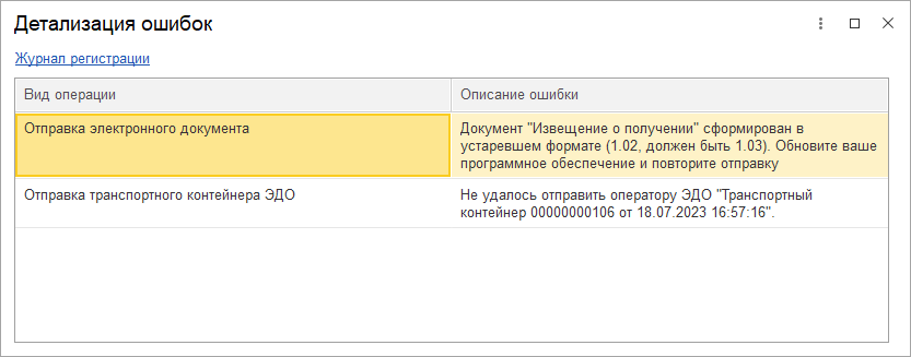 Пользователю необходимо выполнить рекомендации по обновлению программного продукта до актуального релиза (с версией Модуля ЭДО 1.9.9.56 и выше) или выполнить установку патчей (для более ранних версий), а только затем переформировать технологический (служебный) документ «Извещение о получении» в новом формате.