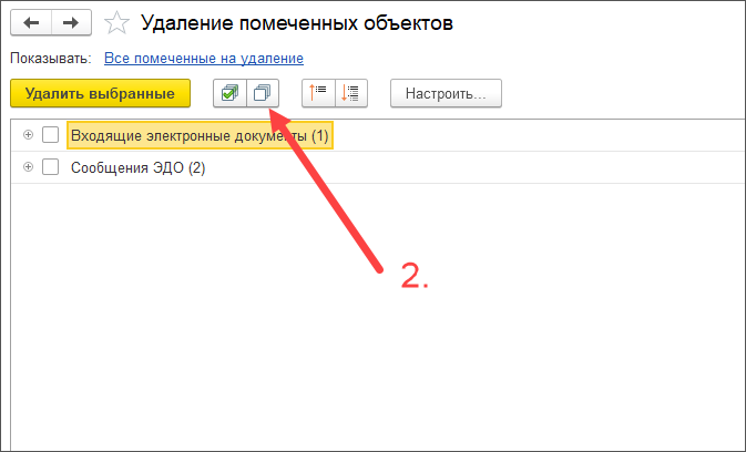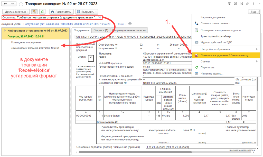 1. Пометить электронный документ на удаление (Ещё – Пометить на удаление / Снять пометку).