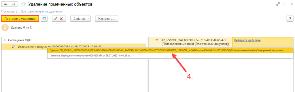 5. Связанные элементы будут представлены в правой части списка. Требуется нажать на гиперссылку «Выберите действие» - «Удалить DP_IZVPOL», и выполнить команду «Повторить удаление».
