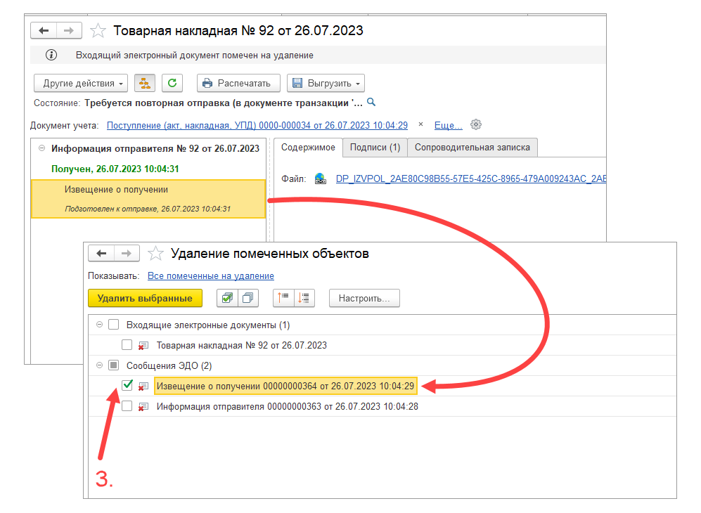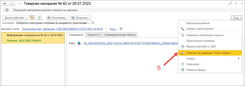 6. Затем следует открыть входящий электронный документ (найти его можно в Архиве ЭДО), и снять пометку на удаление (Ещё – Пометить на удаление / Снять пометку).