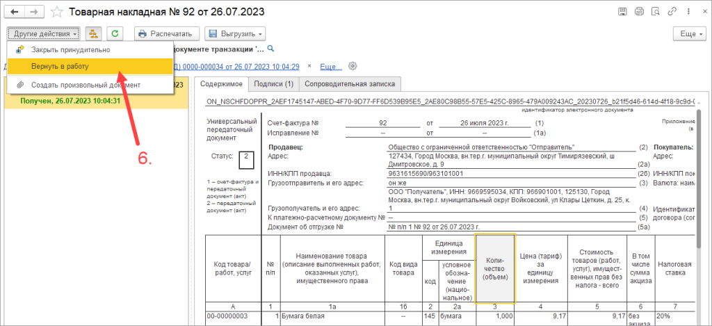 7. Вернуть документ в работу (Другие действия – Вернуть в работу).