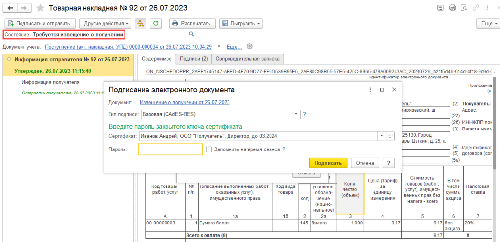 8. Извещение о получении будет автоматически сформировано, подписано и отправлено контрагенту при обработке входящего документа.