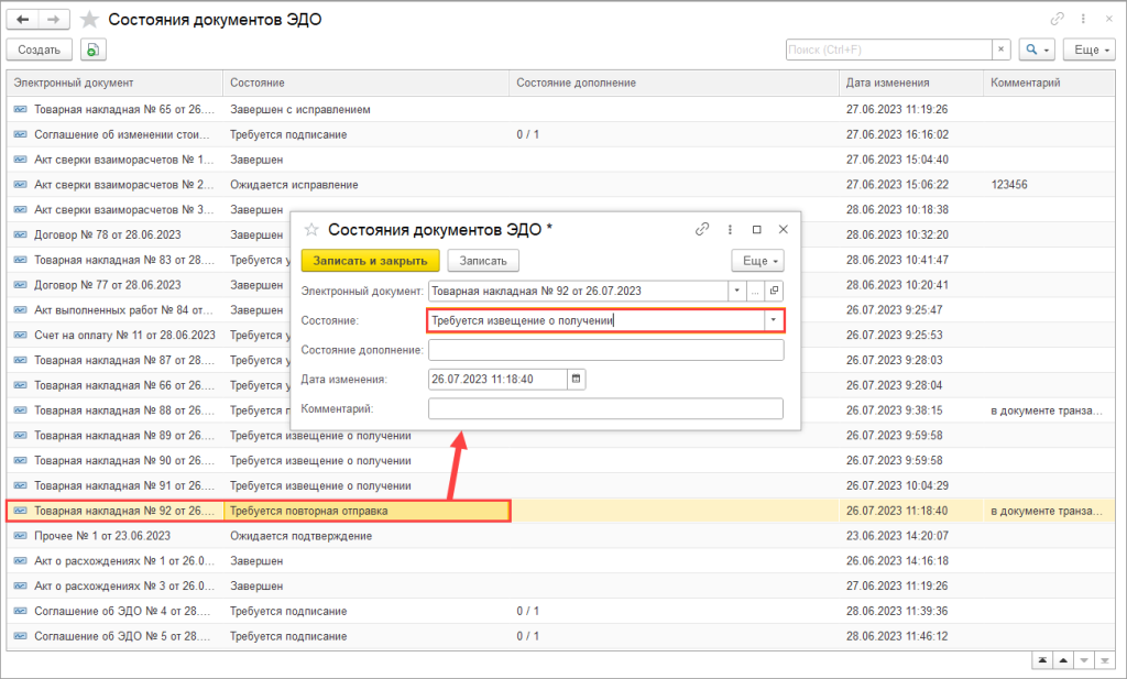 При необходимости состояние документа можно самостоятельно изменить на «Требуется извещение о получении» в Регистре сведений – Состояния документов ЭДО (e1cib/list/РегистрСведений.СостоянияДокументовЭДО).