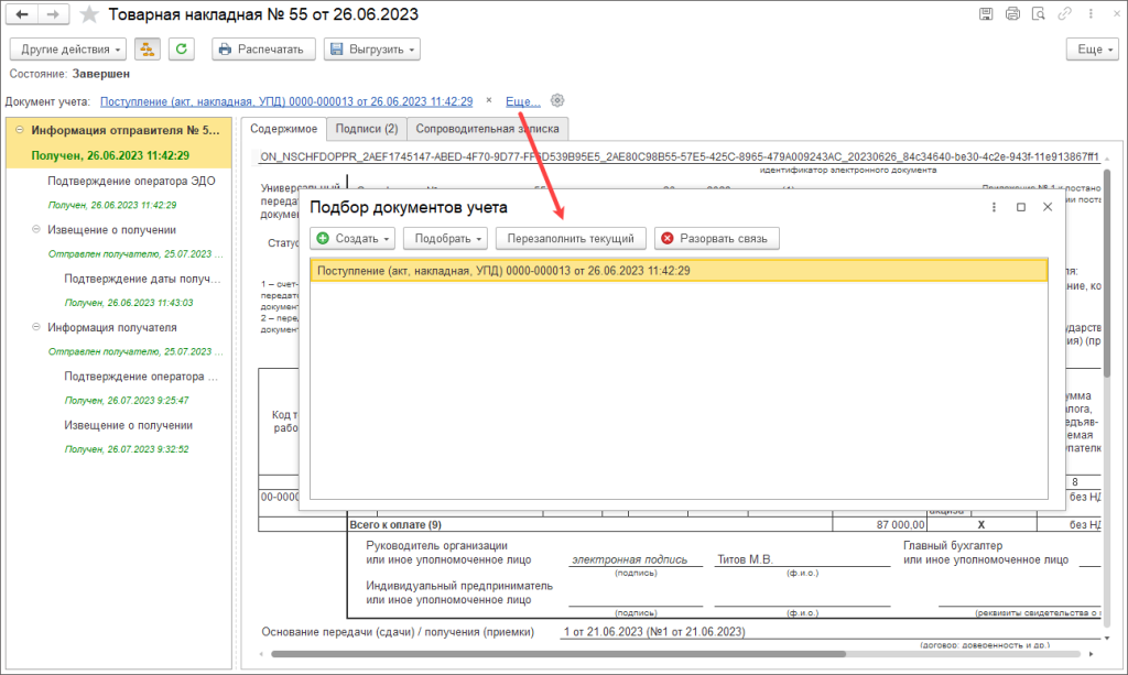 Если при переходе к электронному документу из документа учёта выходит сообщение "Электронный документ отсутствует", а состояние ЭДО в поступлении не соответствует состоянию в электронном документе, необходимо выполнить команду "Ещё - Перезаполнить текущий".