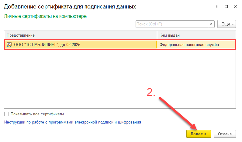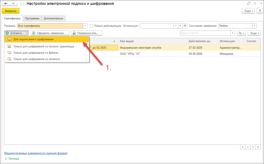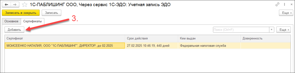 В открывшемся списке требуется нажать «Добавить», выбрать обезличенный сертификат и завершить процедуру регистрации нового сертификата нажатием «Записать и закрыть»