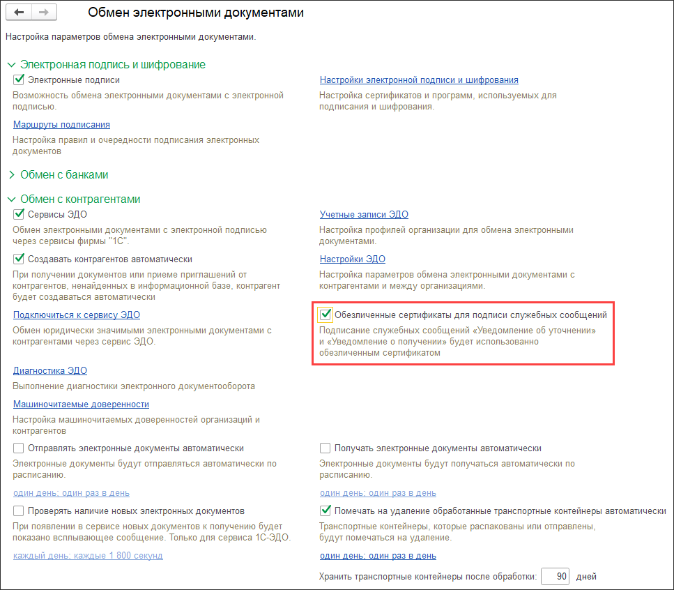 Для подписания служебных сообщений обезличенным сертификатом необходимо включить соответствующую настройку в разделе «Администрирование - Обмен электронными документами - Обмен с контрагентами - Обезличенные сертификаты для подписи служебных сообщений».