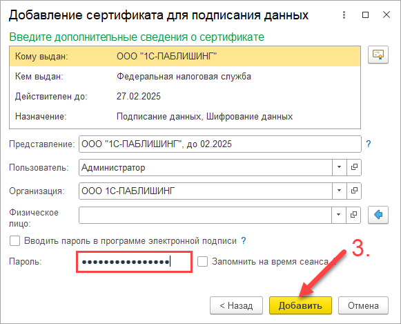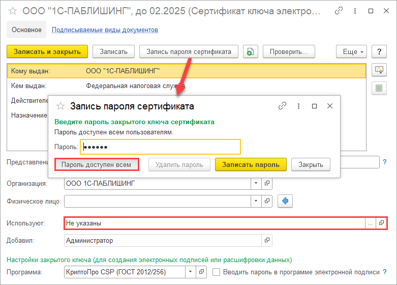 Если сертификат планируется применять для автоматического получения и отправки документов, то значение поля «Используют» должно быть «Не указаны», а пароль должен быть записан в программе без привязки к пользователю.