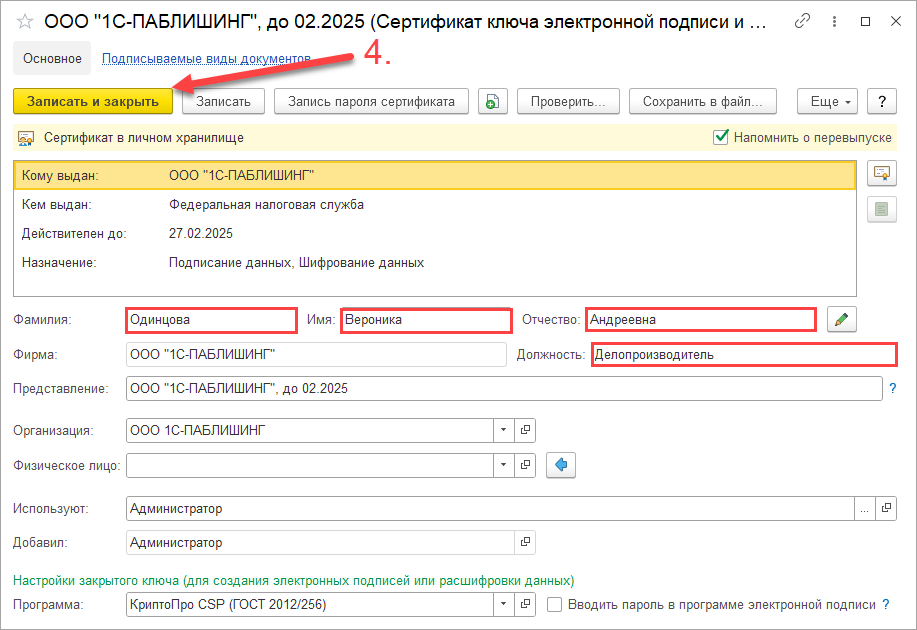 В карточке обезличенного сертификата необходимо заполнить ФИО и должность ответственного сотрудника. Это справочные данные, указывающие на то, кто будет отвечать за использование данного обезличенного сертификата.