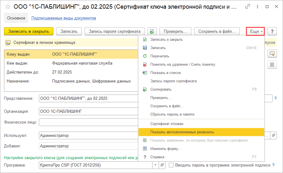 Если после сохранения данную информацию необходимо будет изменить, то в карточке сертификата следует нажать «Ещё – Показать автозаполняемые реквизиты» и указать нового ответственного сотрудника.