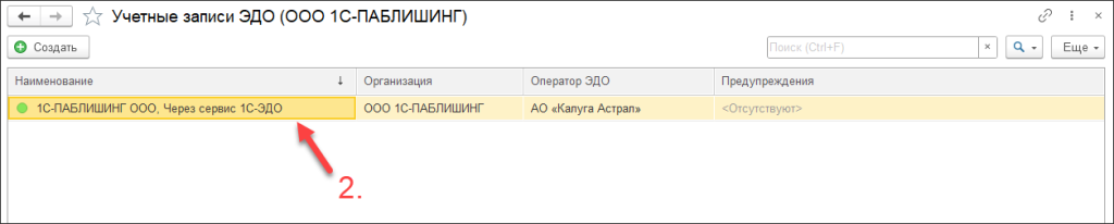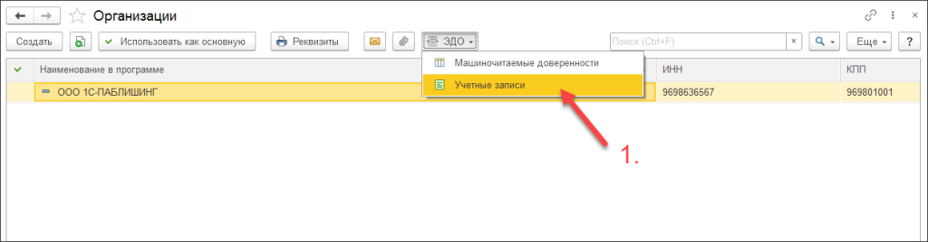 Для регистрации обезличенного сертификата в Учётной записи ЭДО следует перейти в карточку организации и выполнить команду «ЭДО-Учётные записи»